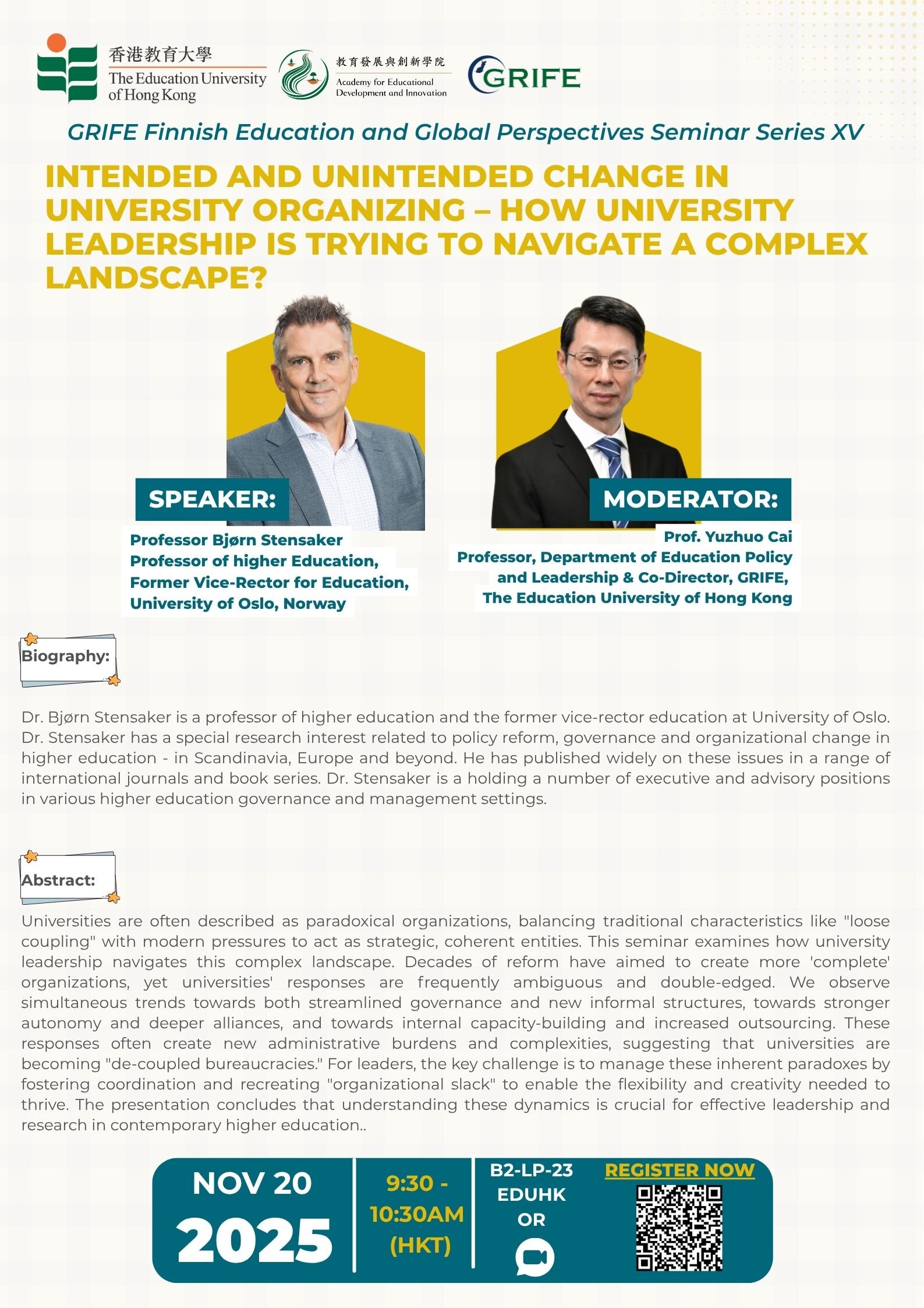 We are delighted to invite you to the upcoming GRIFE Seminar Series XV, titled " Intended and unintended change in university organizing – how university leadership is trying to navigate a complex landscape? ”.