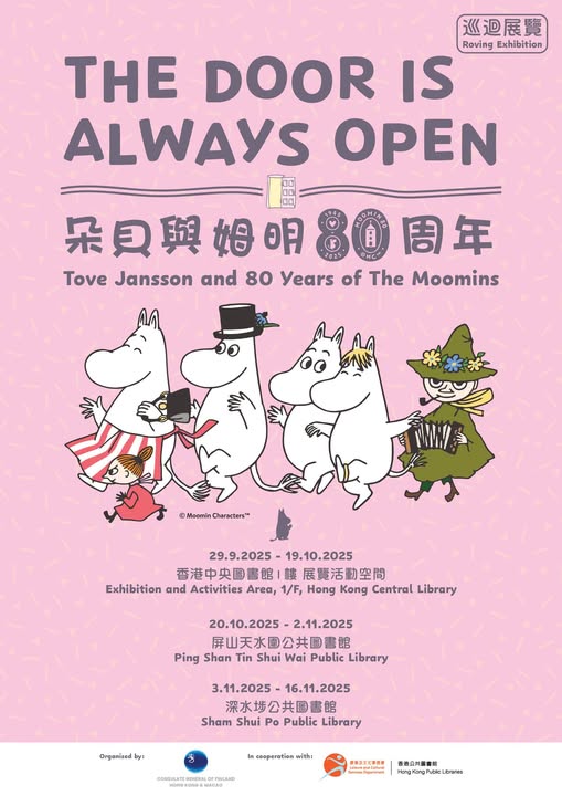 Learn more about the exhibition via the link at : https://www.hkpl.gov.hk/en/extension-activities/event/281565/roving-exhibition-of-the-door-is-always-open-tove-jansson-and-80-years-of-the-moomins