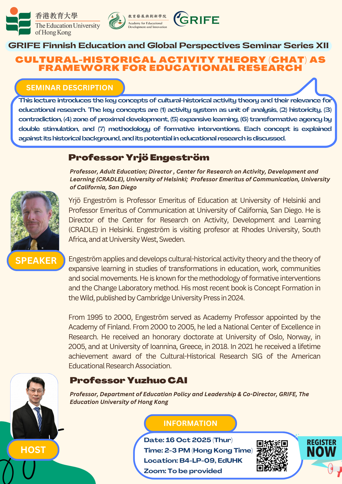 We are delighted to invite you to the upcoming GRIFE Seminar Series XII, titled " CULTURAL-HISTORICAL ACTIVITY THEORY (CHAT) AS FRAMEWORK FOR EDUCATIONAL RESEARCH ”.
