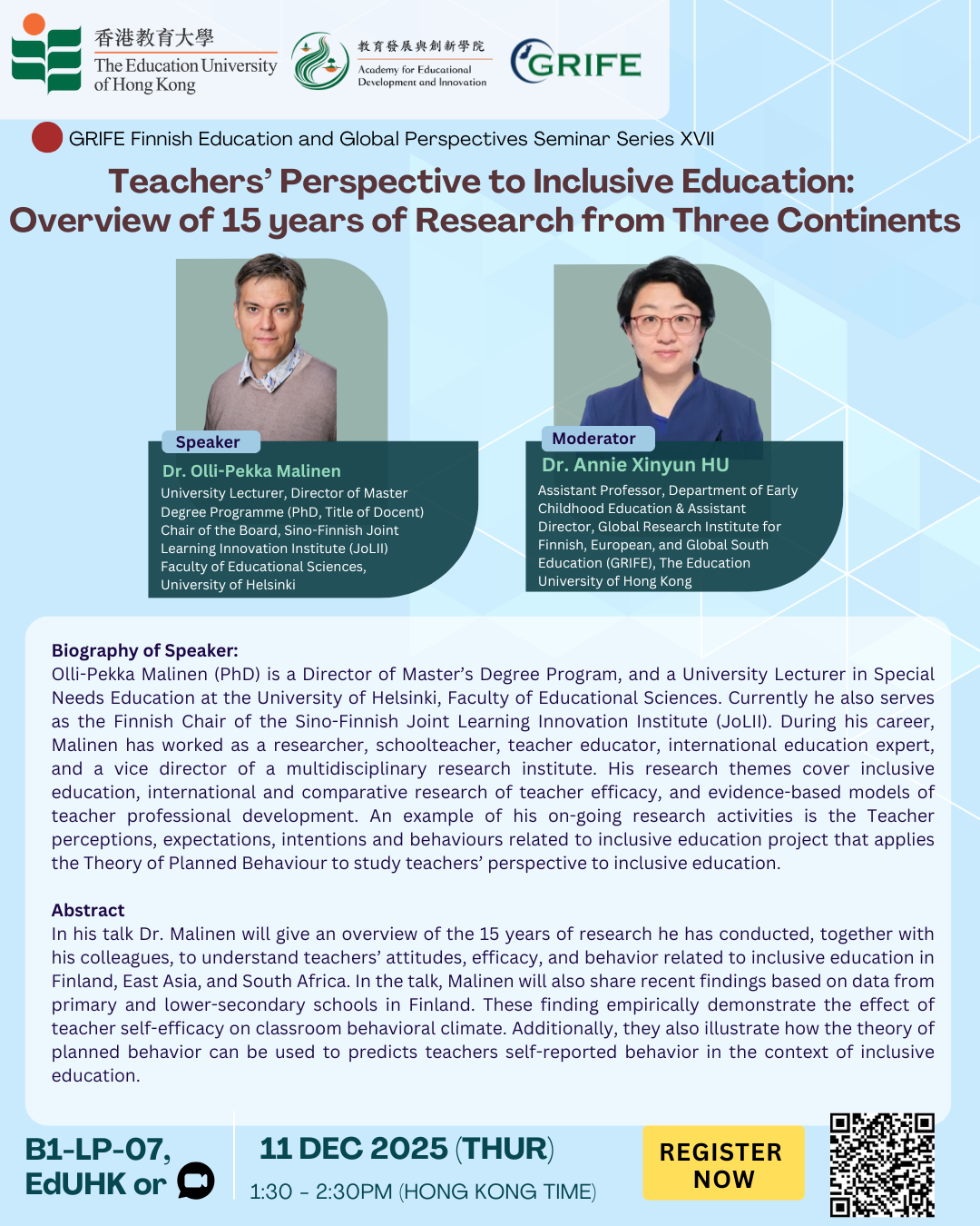 | Moderator | Dr. Annie Xinyun HU, Assistant Professor, Department of Early Childhood Education & Assistant Director, Global Research Institute for Finnish, European, and Global South Education (GRIFE), The Education University of Hong Kong