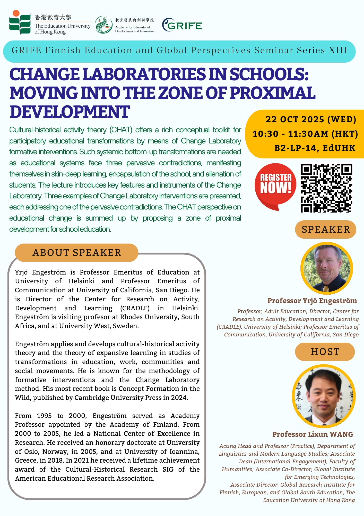 We are delighted to invite you to the upcoming GRIFE Seminar Series XIII, titled " CHANGE LABORATORIES IN SCHOOLS: MOVING INTO THE ZONE OF PROXIMAL DEVELOPMENT ”.