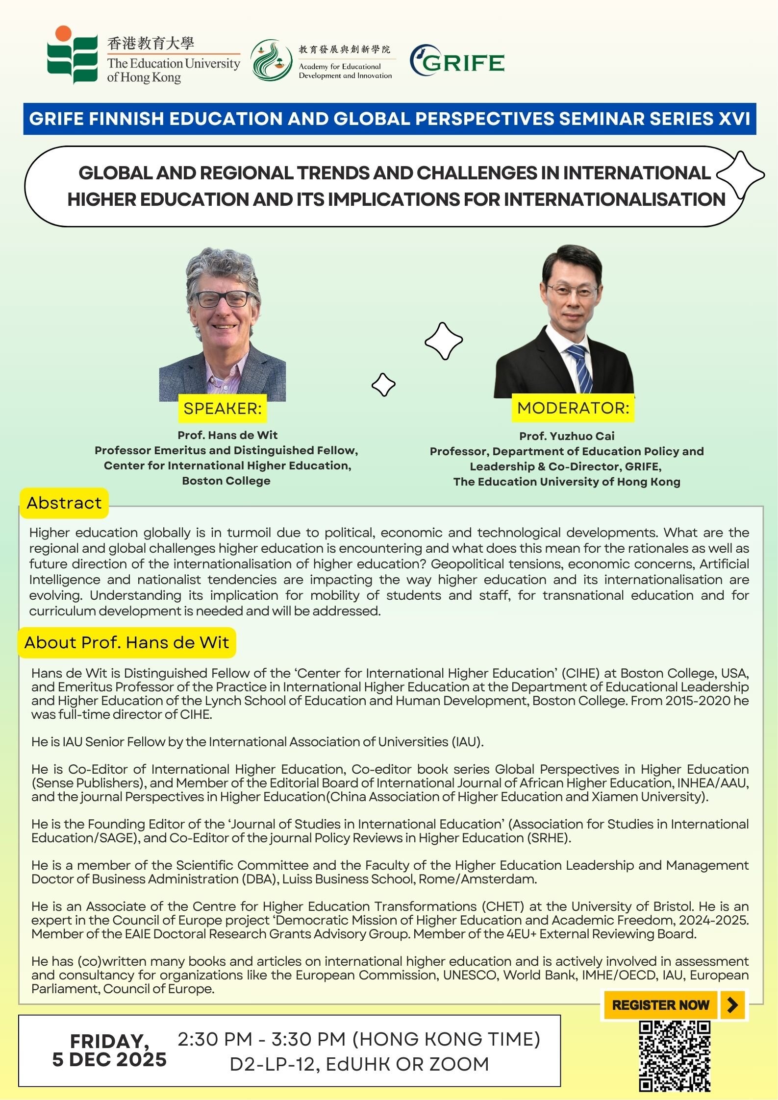 我们诚挚邀请您参加即将举办的GRIFE研讨会系列XVI,主题为「Global and Regional Trends and challenges in international higher education and its implications for internationalisation 」。