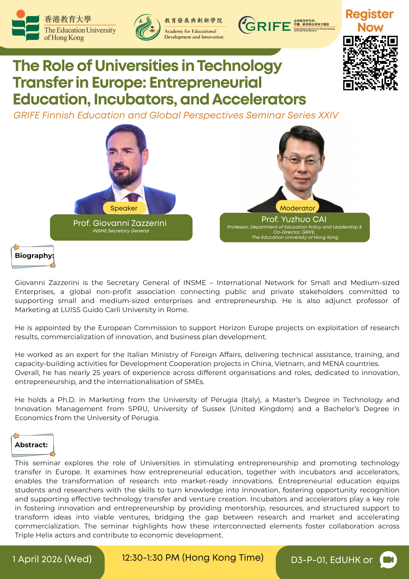 我们诚挚邀请您参加即将举办的GRIFE研讨会系列XXIV,主题为「欧洲大学在技术转移中的角色:创业教育、育成中心与加速器 The Role of Universities in Technology Transfer in Europe: Entrepreneurial Education, Incubators, and Accelerators」。