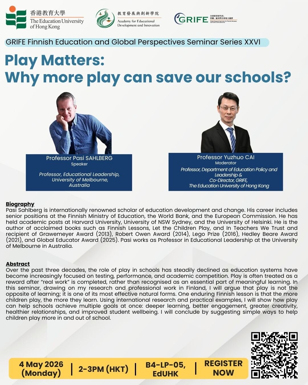 我们诚挚邀请您参加即将举办的GRIFE研讨会系列XXVI,主题为「玩乐的力量:多点游戏,如何挽救学校?」。