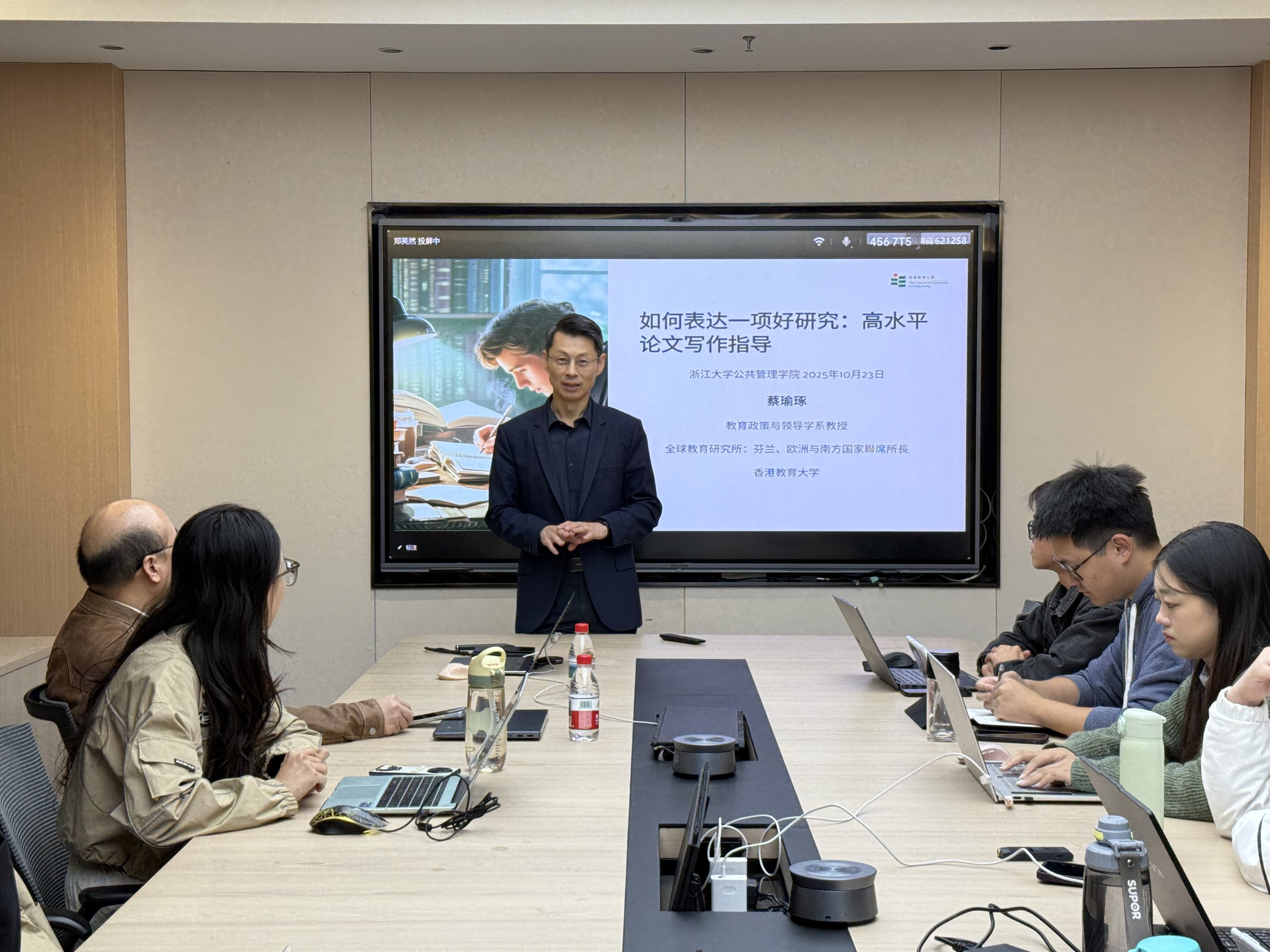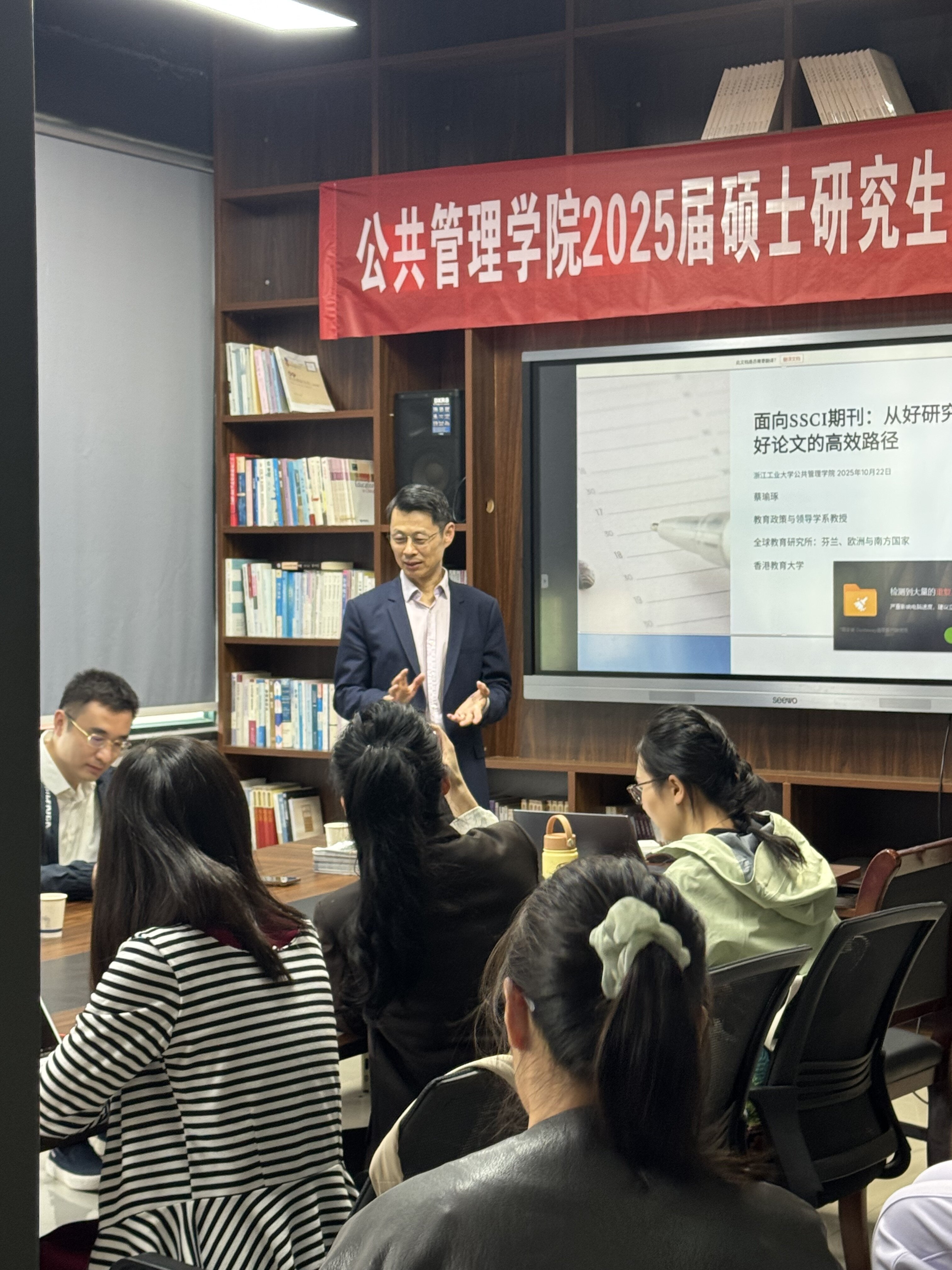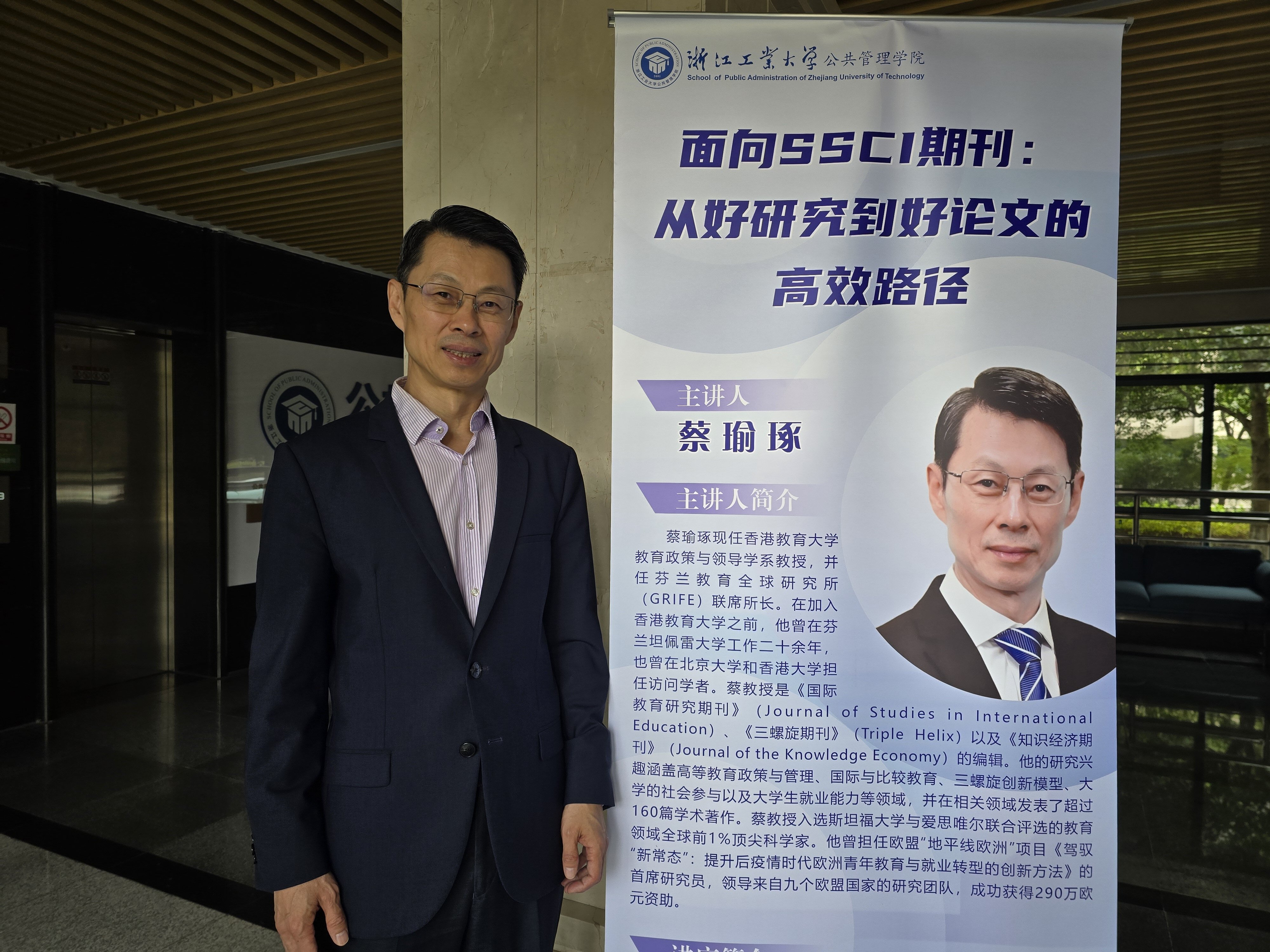在2025年10月21日至23日期間,蔡教授先後參訪浙江工業大學、浙江外國語學院及浙江大學,與師生就「面向SSCI期刊:從好研究到好論文的高效路徑」、「芬蘭教育理念與東方智慧:不謀而合?」以及「如何表達一項好研究:高水平論文寫作指導」進行深入交流。他介紹香港教育大學教育發展與創新學院(AEDI)及應用政策研究與教育未來學院(AAPSEF)所開設的創新碩士課程。其中,「比較教育與協同創新文學碩士」課程成為介紹焦點。除了提升學生在比較教育進行分析,研究、論文寫作的能力,蔡教授特別闡述了此課程基於「三螺旋模型」(即大學-產業-政府協同推動創新的框架)的獨特全球定位,通過專業設計,培養學生在政策分析、專案協調及生態系統設計方面的高階能力,從而幫助他們建立並強化跨部門合作夥伴關係。