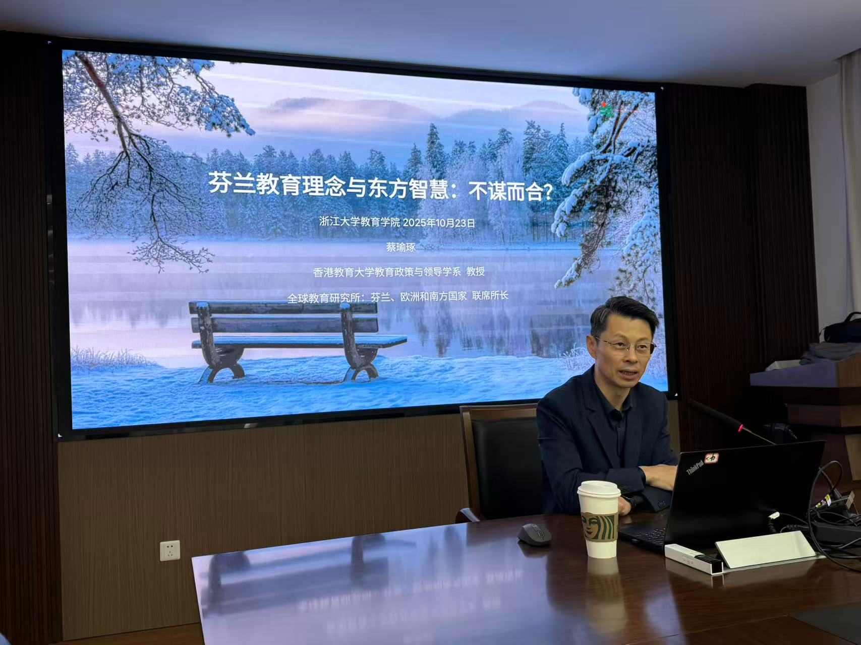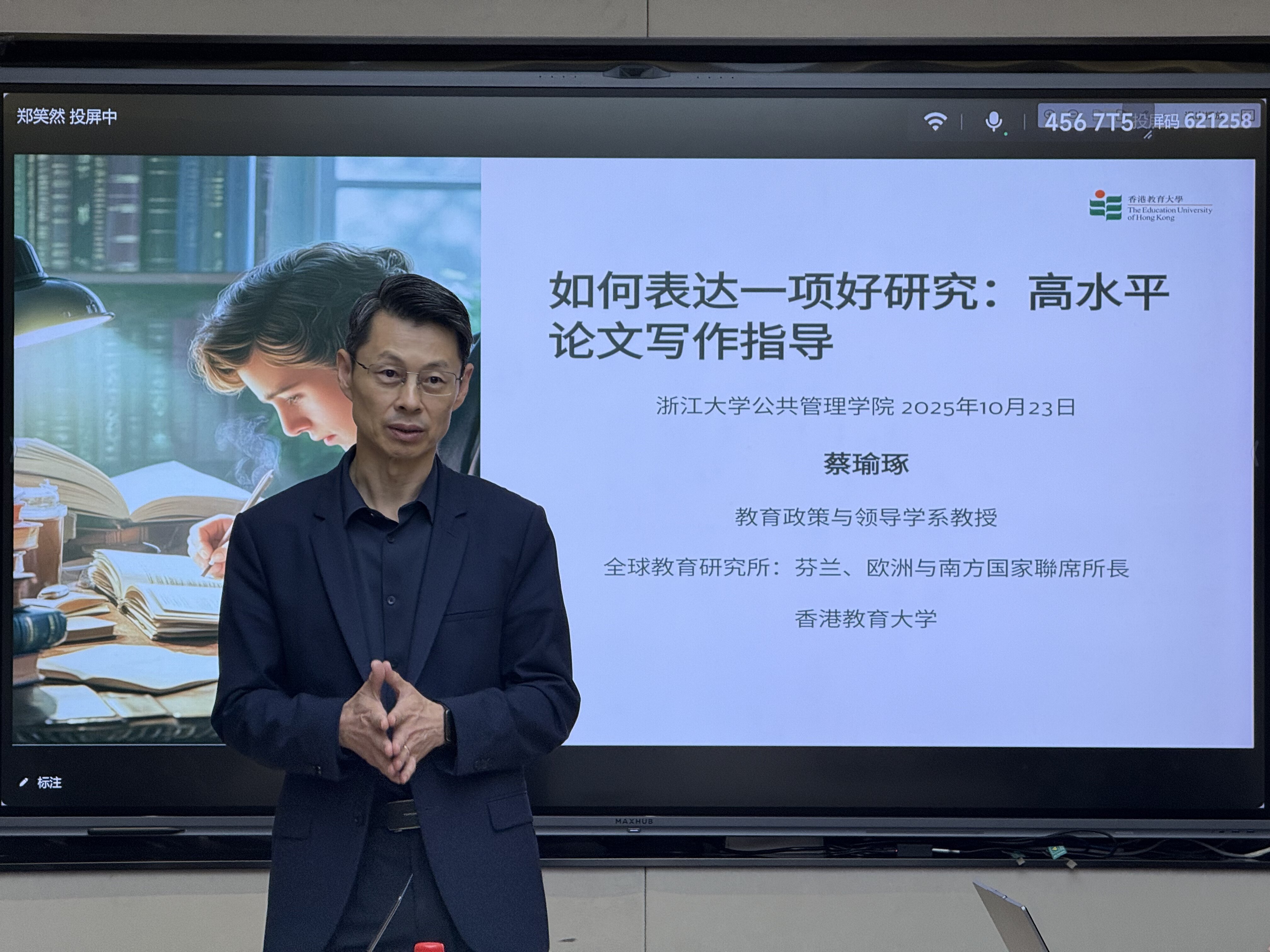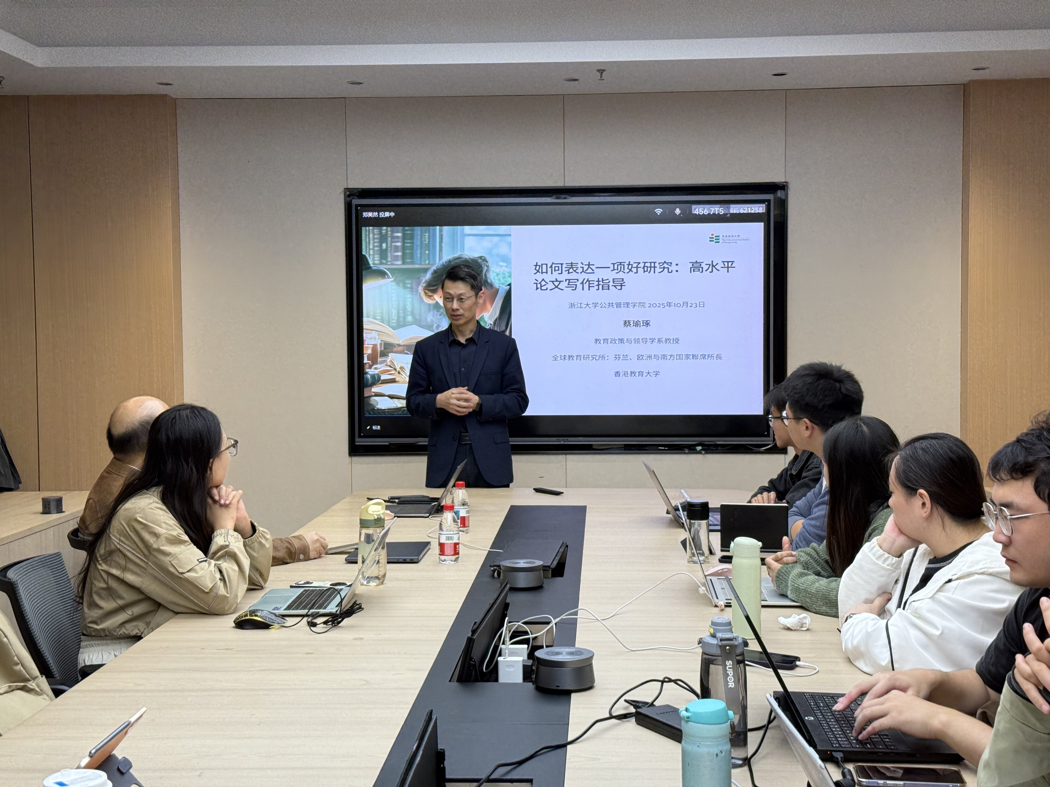 在2025年10月21日至23日期間,蔡教授先後參訪浙江工業大學、浙江外國語學院及浙江大學,與師生就「面向SSCI期刊:從好研究到好論文的高效路徑」、「芬蘭教育理念與東方智慧:不謀而合?」以及「如何表達一項好研究:高水平論文寫作指導」進行深入交流。他介紹香港教育大學教育發展與創新學院(AEDI)及應用政策研究與教育未來學院(AAPSEF)所開設的創新碩士課程。其中,「比較教育與協同創新文學碩士」課程成為介紹焦點。除了提升學生在比較教育進行分析,研究、論文寫作的能力,蔡教授特別闡述了此課程基於「三螺旋模型」(即大學-產業-政府協同推動創新的框架)的獨特全球定位,通過專業設計,培養學生在政策分析、專案協調及生態系統設計方面的高階能力,從而幫助他們建立並強化跨部門合作夥伴關係。