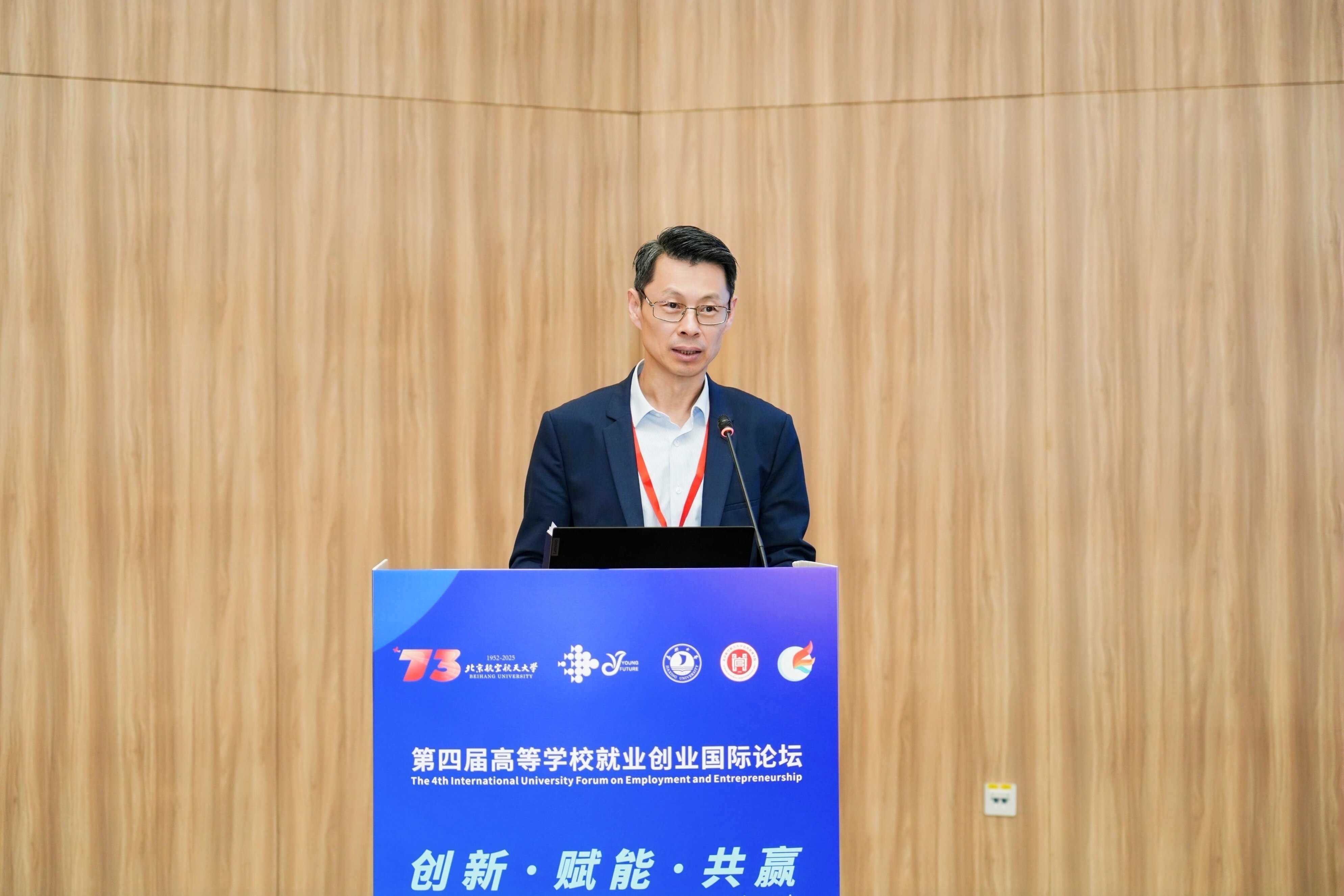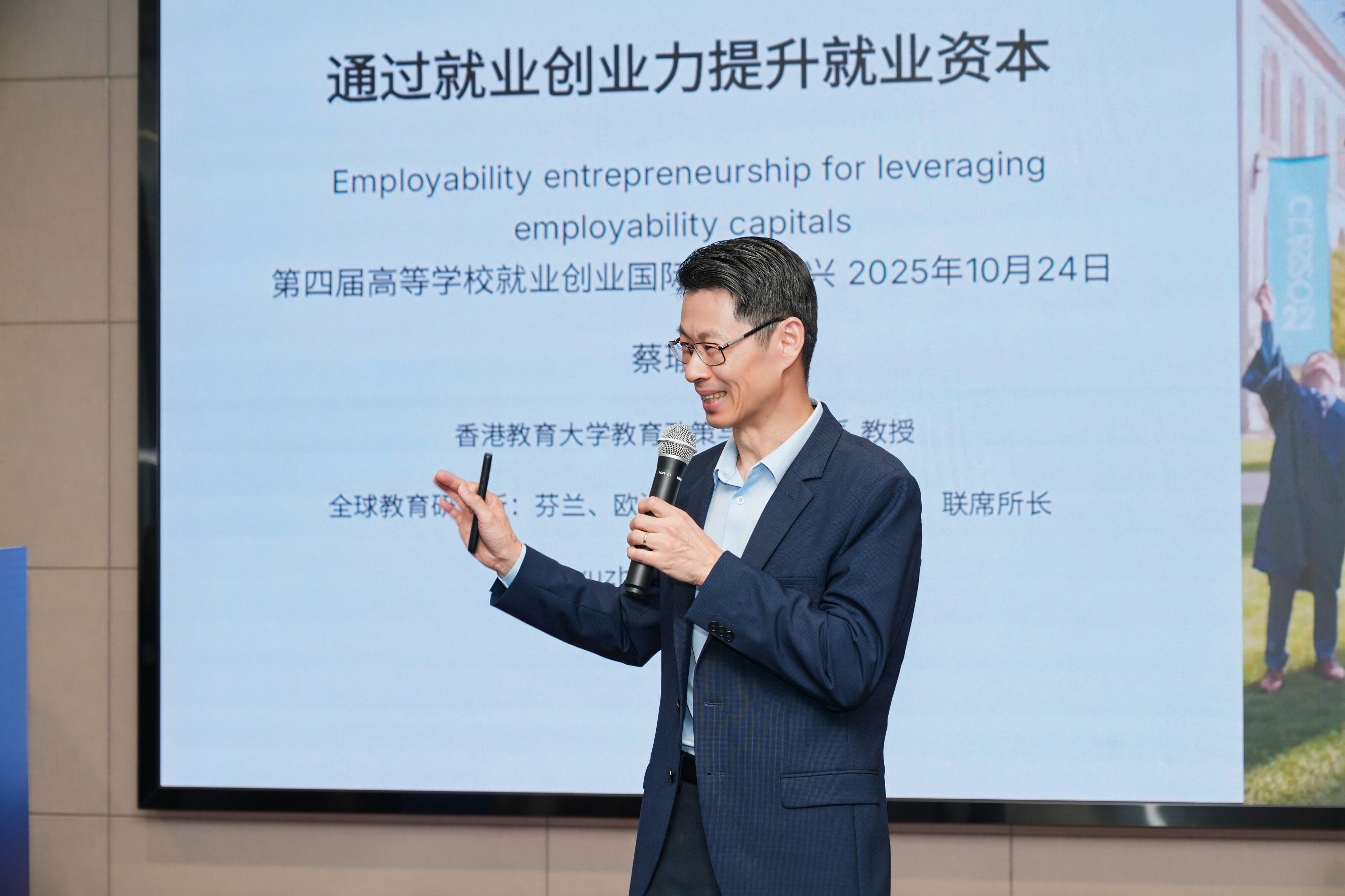 接著,於2025年10月24日至25日,由北京航空航天大學與高校畢業生就業協會共同主辦,在嘉興舉行的「高等教育就業創業國際論壇」上,蔡教授發表其最新研究成果,並參與關於當代教育議題與青年就業能力的高層對話。演講中,他鼓勵與會者發掘自身潛能與才華,把握各種機會積累多元經驗,並建立專業人際網絡以拓展未來職業前景。
