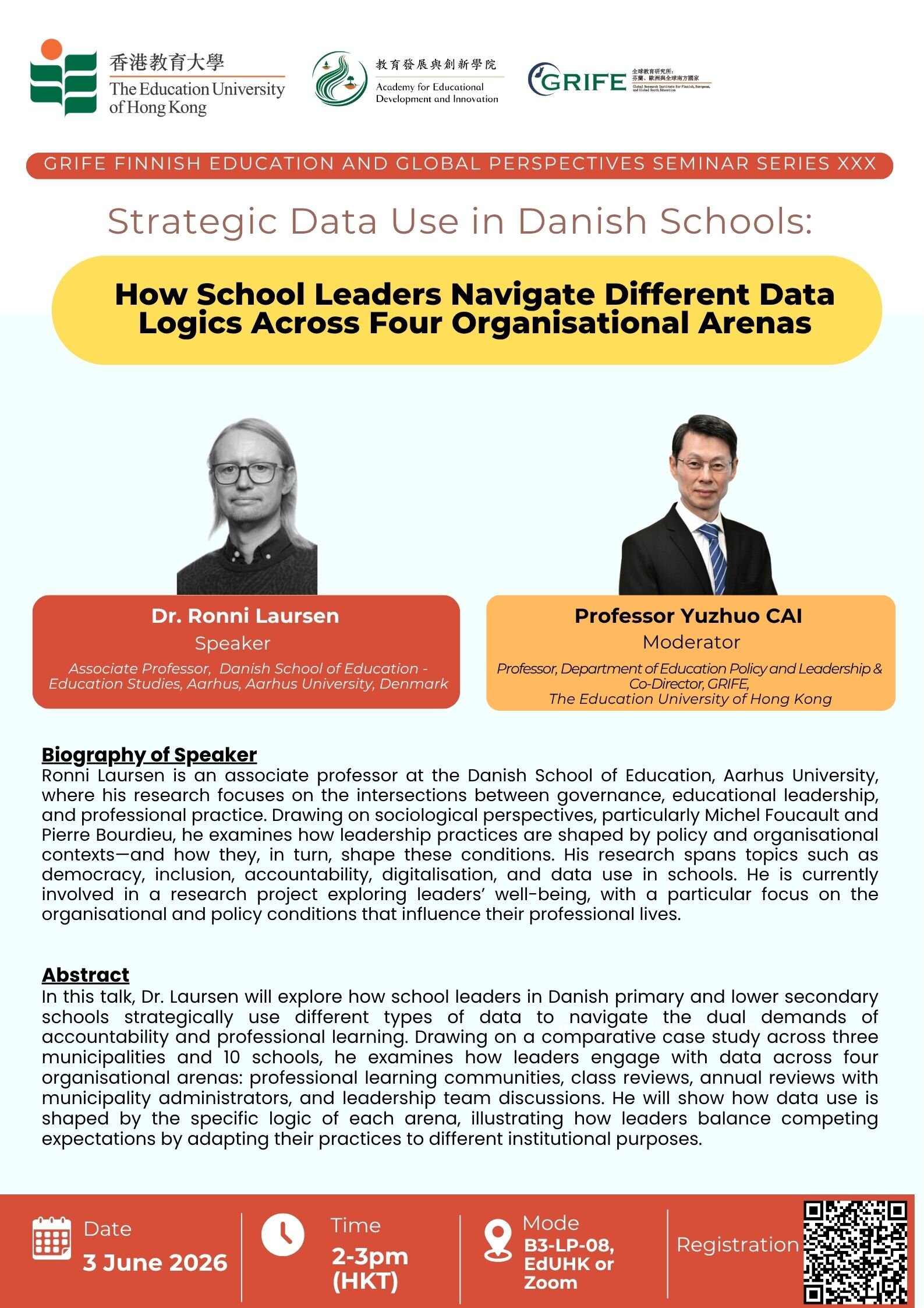 在本場演講中,Ronni LAURSE副教授將探討丹麥小學及初中的學校領導者,如何策略性地運用不同類型的數據,以應對「問責制」與「專業學習」之間的雙重要求。他將透過一項涵蓋三個市鎮、十所學校的比較案例研究,檢視領導者如何在四個組織場域中運用數據:專業學習社群、班級審查、與市鎮行政人員的年度檢討,以及領導團隊討論。他將說明,數據的使用如何受到每個場域的特定邏輯所形塑,並闡述領導者如何藉由調整實務作法以適應不同的制度目的,從而在相互衝突的期望之間取得平衡。